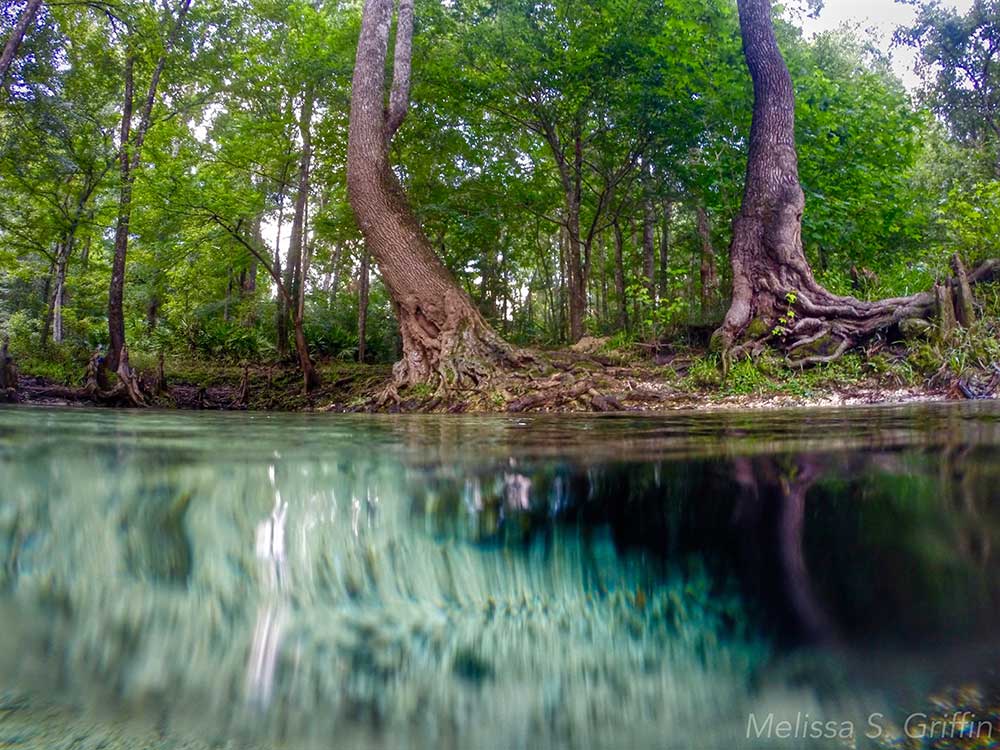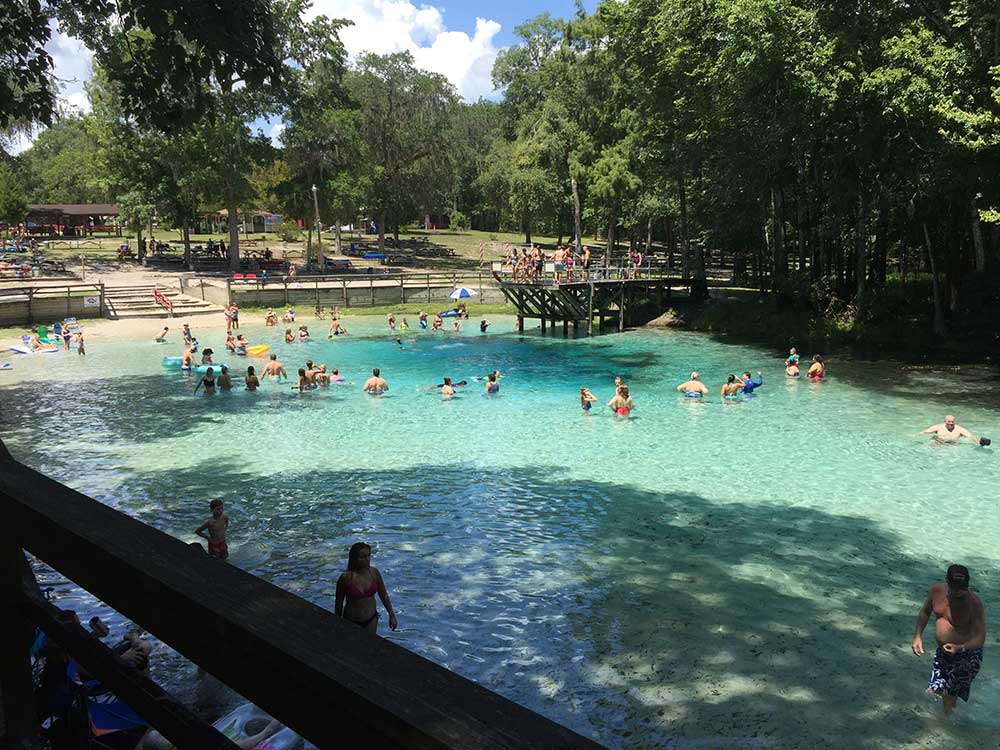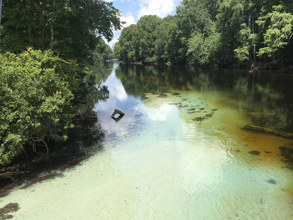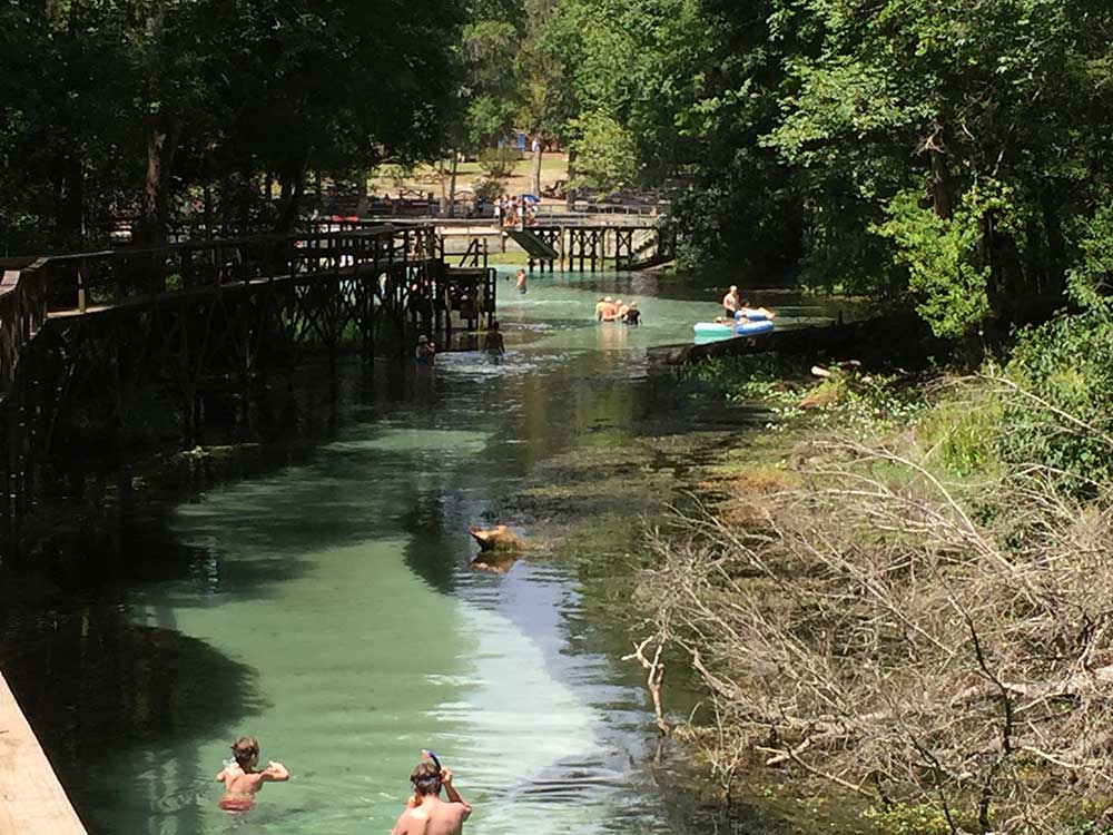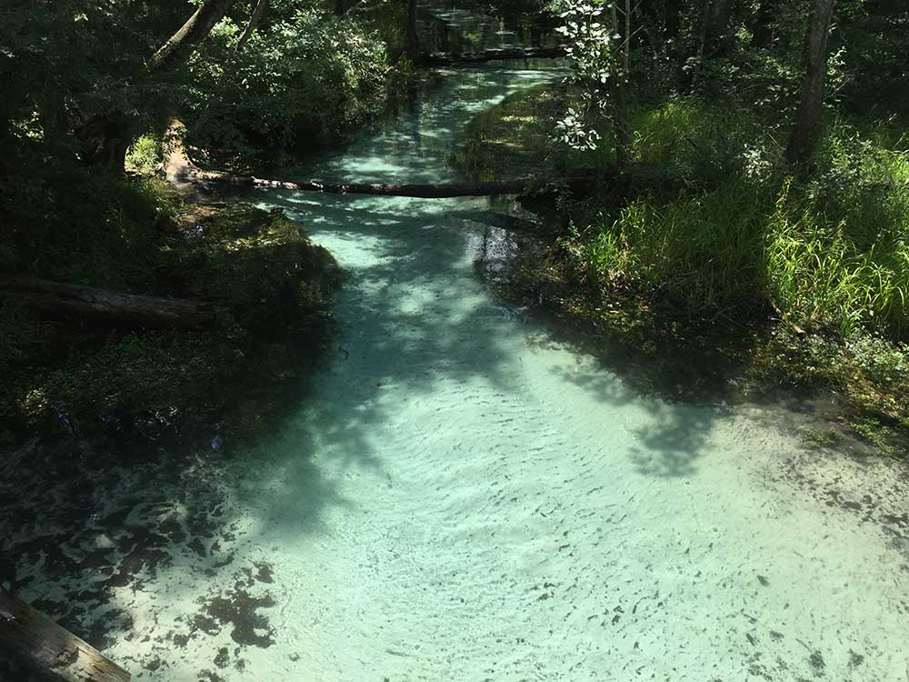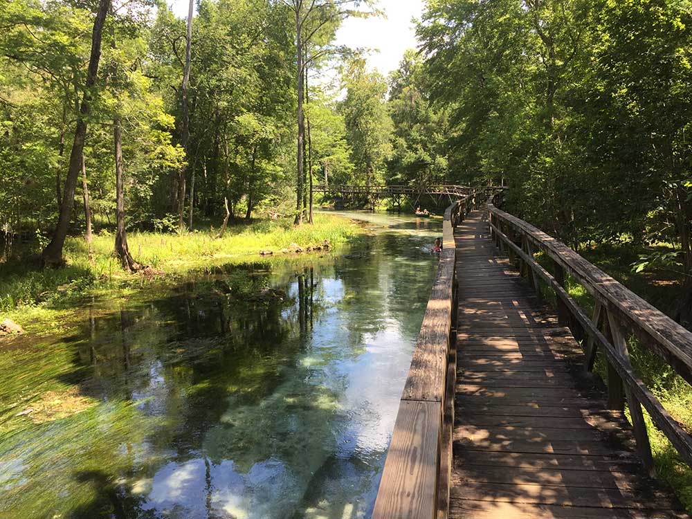 The 72-degree Farenheit water is the same temperature year-round and provides a refreshing break in the hot weather. You can bring a tube and float down the spring run to the Santa Fe River. An elevated quarter mile-long wooden boardwalk extends from Blue Spring north along the spring run to the Santa Fe River.