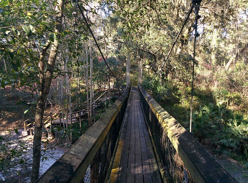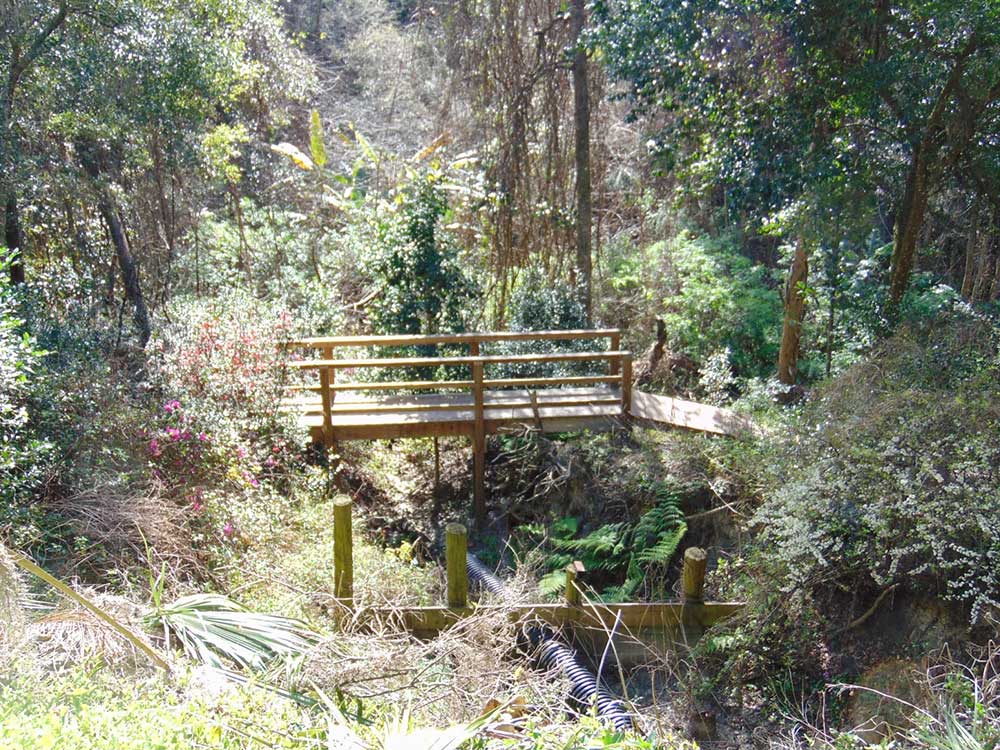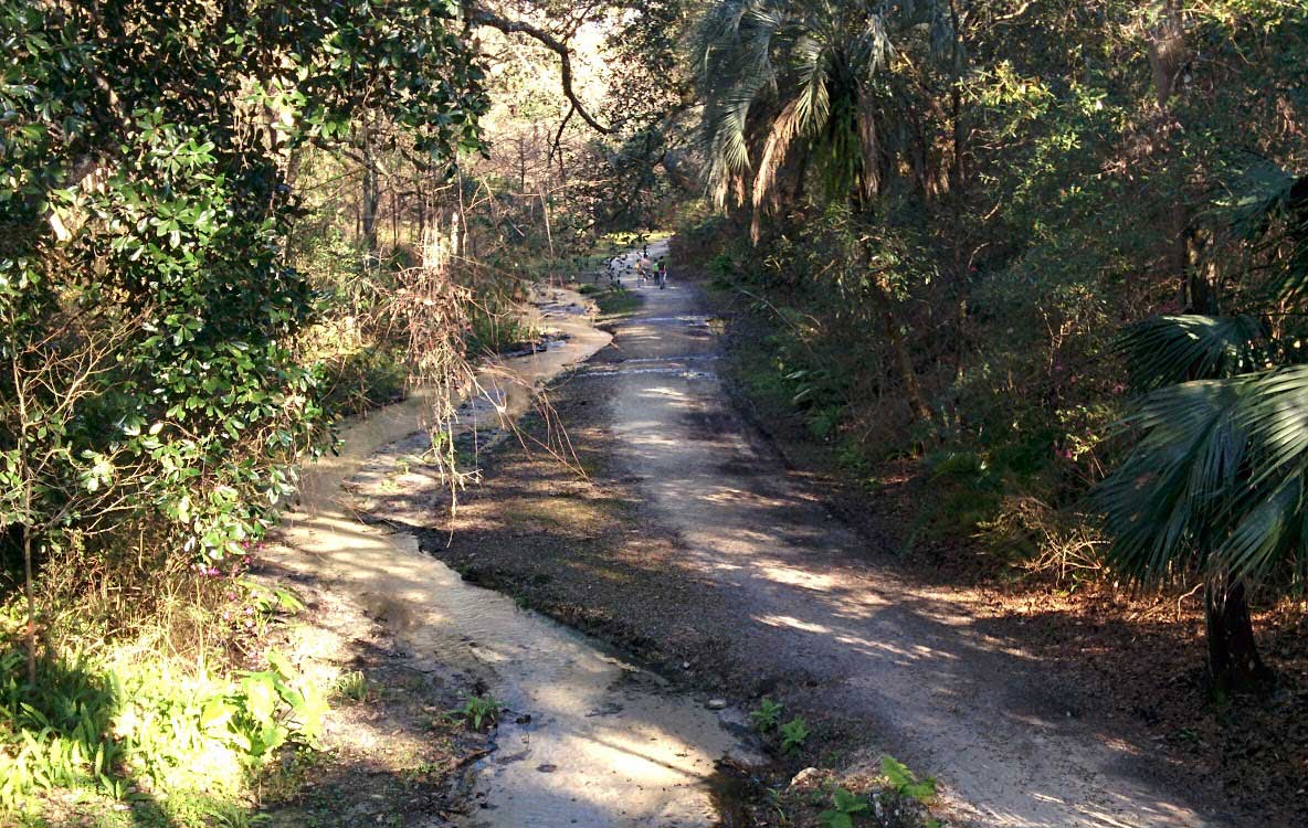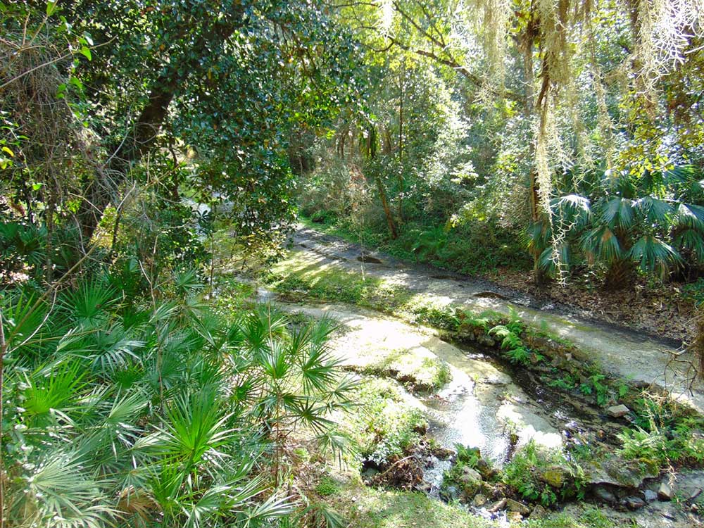 The park has two ravines up to 120 feet deep with steep banks at 45 degree angles. Unlike common gullies, trenches or sinkholes caused by temporary flooding, the steephead ravine is a permanent feature with a spring-fed creek that never dries up, called Whitewater Branch. The underground water bubbling up cuts into the bank and carries the sand and soil downstream to the St. Johns River.